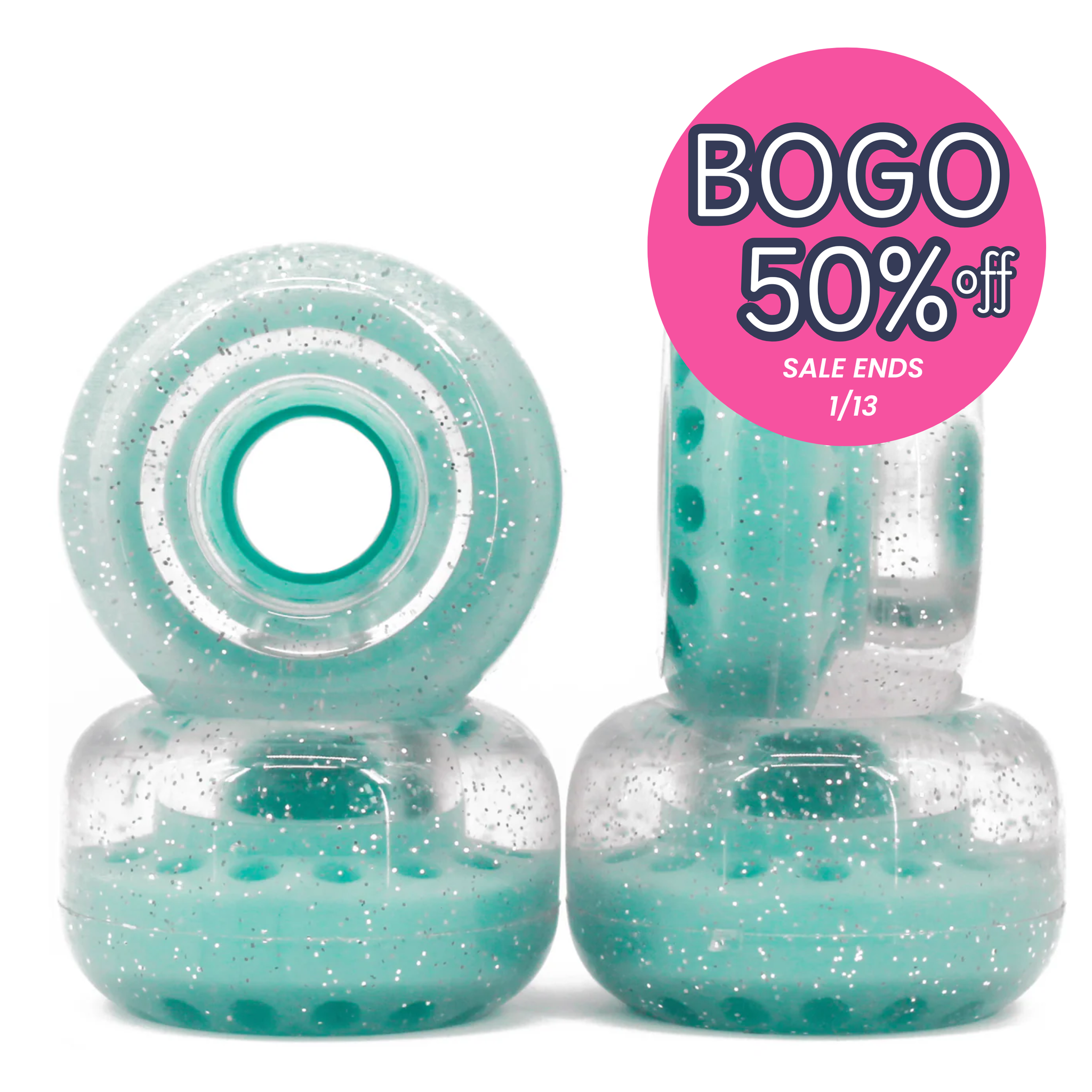 The BTFL replacement wheel Set comes in the color combination transparent/Teal with Glitter and is the replacement wheel for our model Ava Pro. However, they are suitable for any roller skate.